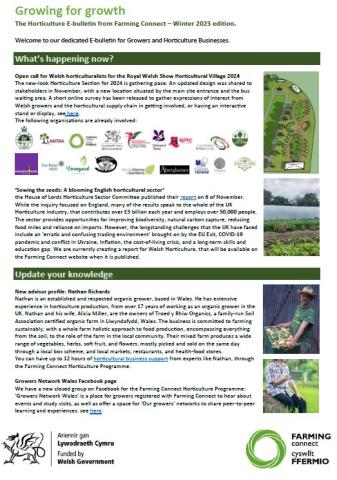 The Horticulture E-bulletin from Farming Connect – Winter 2023 Type Factsheets Key Sector Horticulture Theme Business, Land The Horticulture E-bulletin from Farming Connect – Winter 2023.pdf [.PDF, 562.27 KB] Related News and Events 8 September 2025 Livestock Genetic Improvement To Reduce Ghg Emissions Type: Factsheets Key Sector: Arable, Beef, Dairy, Mixed, Poultry, Sheep Theme: Business, Livestock 4 September 2025 Thinking About Regenerative Farming Type: Factsheets Key Sector: Arable, Beef, Dairy, Mixed, Poultry, Sheep Theme: Business, Land, Livestock Key Specialism: Regenerative Farming 4 September 2025 Plant Passports Type: Factsheets Key Sector: Horticulture Theme: Land More News and Events