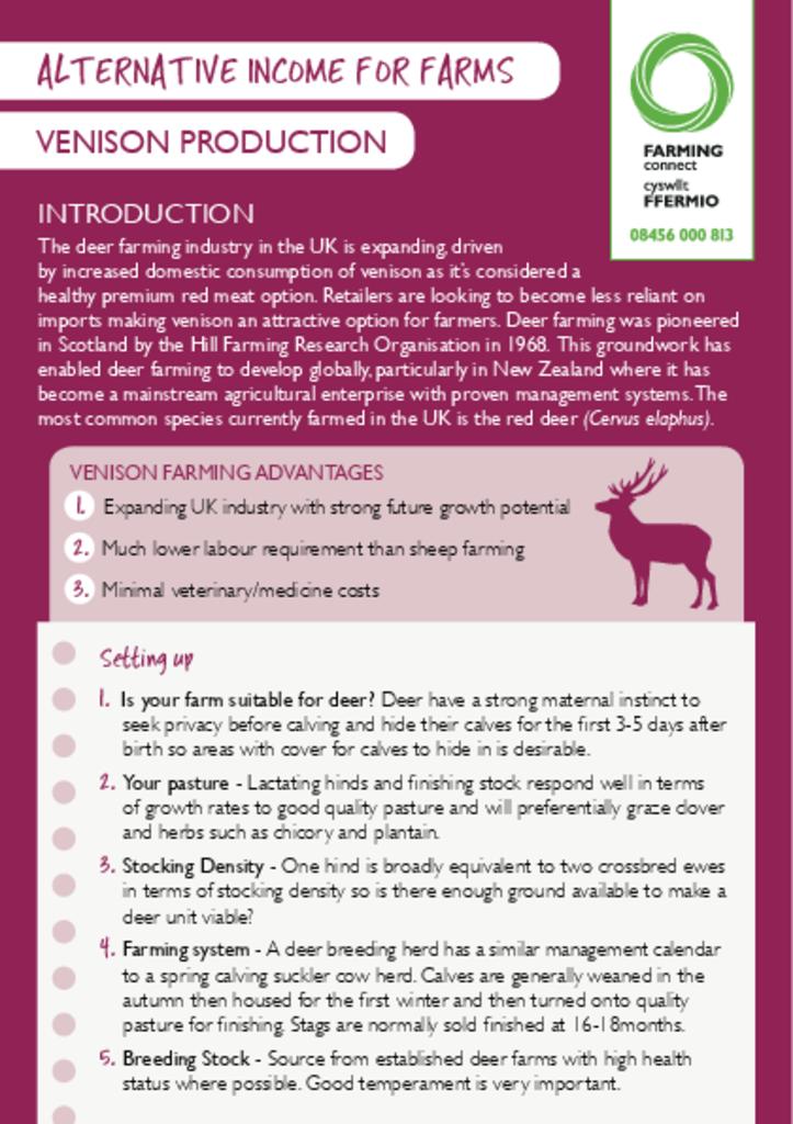 Venison Production 24/04/2018 Type Factsheets Key Sector Alternative Livestock Theme Livestock cff_taflenarallgyfeirio_venison.pdf [.PDF, 395.63 KB] Related News and Events 8 September 2025 Livestock Genetic Improvement To Reduce Ghg Emissions Type: Factsheets Key Sector: Arable, Beef, Dairy, Mixed, Poultry, Sheep Theme: Business, Livestock 4 September 2025 Thinking About Regenerative Farming Type: Factsheets Key Sector: Arable, Beef, Dairy, Mixed, Poultry, Sheep Theme: Business, Land, Livestock Key Specialism: Regenerative Farming 4 September 2025 Plant Passports Type: Factsheets Key Sector: Horticulture Theme: Land More News and Events