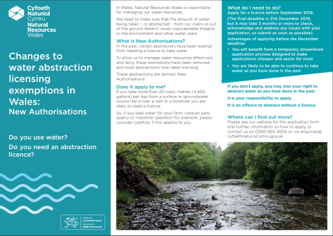 Changes to water abstraction licensing exemptions in Wales: New Authorisations Type News Theme Land 4 June 2019 Do you use water? Do you need an abstraction licence? Related News and Events 26 March 2026 New Farming Connect Programme Launches on 1 April to Support Farmers Across Wales 26 March 2026 Farmers across Wales are being encouraged to make Type: News Key Sector: Arable, Beef, Dairy, Horticulture, Pigs, Poultry, Sheep Theme: Business, Land, Livestock 24 March 2026 Study demonstrates significance of Welsh farmland for bird diversity 24 March 2026 Recordings of birds detected on farmland across Type: News Key Sector: Beef, Dairy, Poultry, Sheep Theme: Land 18 March 2026 Action Required! Farmers and businesses need to re-register with Farming Connect and move to GOV.UK One Login 18 March 2026 The Welsh Government has announced important Type: News Key Sector: Arable, Beef, Dairy, Horticulture, Pigs, Poultry, Sheep Theme: Business More News and Events