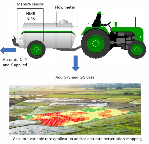 Technologies such as near-infrared spectroscopy (NIRS) are able to perform a quick analysis of animal manures and are showing promise currently for determining carbon and nitrogen fractions and phosphorus (P) content. However, these can suffer from requiring organic material in certain states (eg. finely ground solids as opposed to liquids or vice versa). John Deere for example offer the HarvestLab 3000 which can analyse harvested crops, silage or slurry either during harvest,  during spreader filling or application on tankers. Such systems can also be used stand-alone as an on-farm sampling station giving it significant versatility. Mobile or in system low field nuclear magnetic resonance (NMR) systems have also been suggested as a way to monitor N, P, K and indirect organic N content of animal slurries. These systems have undergone optimisation for mobile in-field applications and have relatively lower costs and safety considerations compared to high field equivalent technologies generally used in labs.