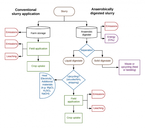 Flow diagram demonstrating the process of conventional slurry storage and application and application to an anaerobic digester. Adapted from Styles et al., (2018).