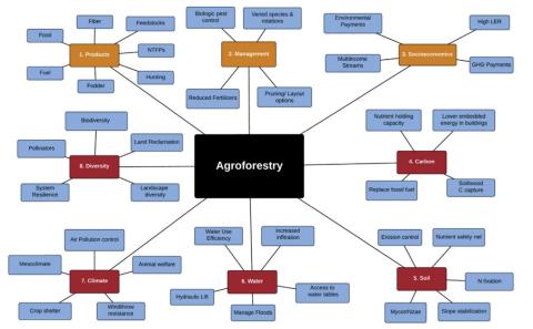 Many of the benefits of agroforestry have been discussed in a previous article but, in short, these include the impact on sustainability, biodiversity, climate change and soil health. For example, agroforestry is suggested to reduce soil erosion and help balance the available nitrogen and phosphorous in soils to the value of £4 - £15 per ha per year in the UK when comparing silvoarable to arable alone. If even half of the current cropable area could be converted to silvoarable that would lead to UK savings of around £24 - £91 million a year. Agroforestry is at the forefront of discussions about being a low-risk, low-investment, high-carbon sequestering land management practice and has several other ecosystem service benefits as noted in the diagram.