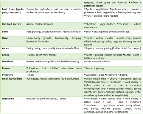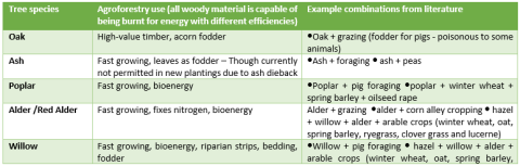 Different tree species have different functions and considerations for best growth conditions within agroforestry with some being quick growing, some slow growing, some producing fodder or alternative revenue food source and others being more compatible for renewable energy production. A general rule of thumb is to plant at 100 stems per hectare as higher numbers could reduce benefits. Though different species in different environments may function best at higher or lower numbers.  The table below presents some broadleaf species researched in Europe and their general functionality.