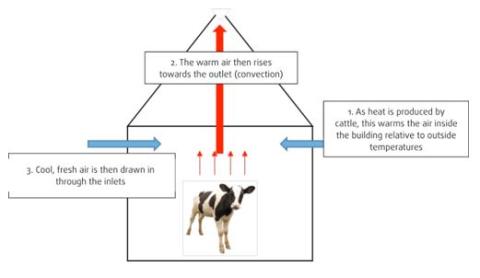 Within livestock sheds in the UK, ventilation is often by non-mechanical means and primarily based on the stack effect, where the heat generated from livestock is thought to be sufficient to move air within sheds (Figure. 1). However, some argue that this is not the case in calf sheds due to the inability of calves to physically produce enough heat to have this effect, especially in large sheds. It is therefore suggested that external air (wind), is the main driver of air movement within sheds. As such there may be times throughout the day and night where ventilation is inadequate. Therefore, it is important to consider the structure of calf housing environments and how buildings are ventilated. With regards to sheds it is recommended that the number of inlets and outlets on buildings are balanced so that fresh air can enter from whichever the wind direction is and be evenly distributed around the building. Likewise, consideration is needed for any structures on farm that are close to housing environments such as trees, other farm buildings or silage pits that may obstruct air flow to the shed.
