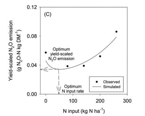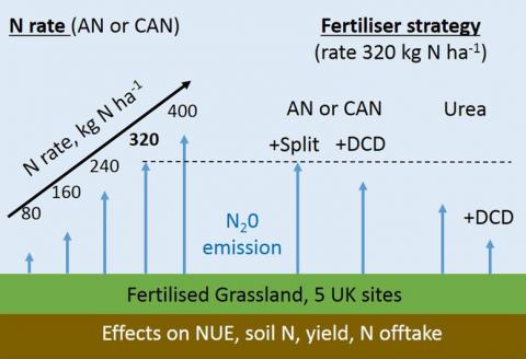 Another complication in on farm calculation of carbon footprint and N use is the significant variability in N utilisation requiring case-by-case assessments of farms. In a study across 5 diverse UK grassland areas, when each area utilised a set N input level (320 kg N ha-1), some saw surplus N levels in soils (causing a greater risk of increased emissions and pollution) which exceeded the EU nitrogen panel's proposed 80 kg N ha-1. This study also indicated that certain fertilisers emit more or less depending on geographic regions and geological make up. A fertiliser supplementation which may be promising is incorporating nitrification inhibitors such as dicyandiamide (DCD) as these directly impact the soil bacteria’s ability to convert N. The types of land where fertilisers are applied can equally impact N utilisation and GHG emissions. In a study under the Glastir schemes advice, grassland, arable and forestry in Wales were compared. This modelling study predicted GHG balances across the country using various assumptions and found that grasslands produced the most GHGs in the form of N2O, whilst storing a very small amount of carbon (C) and methane (CH4), followed by arable land. Forests acted as a sink or offset for all types of GHG investigated. This supports evidence for Glastir providing funding for increased woodland creation and riparian buffer zones management. A 20% reduction in N fertiliser was suggested only to produce a 7% reduction in estimated GHG production, whilst a 40% reduction resulted in a 25% reduction in GHGs. This demonstrates the non-linear tendency of N emissions, the importance of knowing your soil and crop needs and even the characteristics of individual fields can all factor into this.