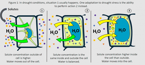On the other hand, drought tolerance refers more to how the plant copes with the effects of drought, particularly on a cellular level. Often this involves the production of hormones and chemical compounds that balance the movement of water in and out of the cell and maintain a healthy cell membrane (figure 1). Also known as ‘osmotic adjustment’ a plant can control the flux of water through the concentration of solutes inside the cell down to minuscule levels (figure 1). This helps to maintain the correct amount of pressure inside the cell and a healthy cell membrane, which in turn keeps plant tissue healthy and avoids necrosis (often seen as ‘browning’).