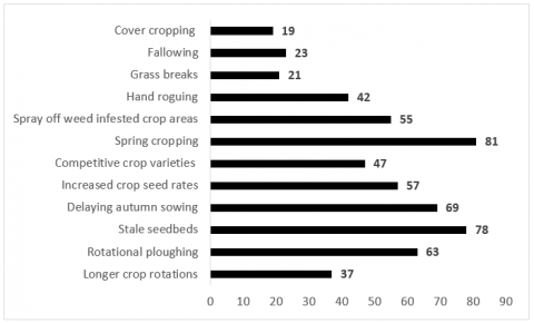 Percentage proportion of 384 farms main cultural control techniques for grass-weeds (Monsanto UK Ltd)