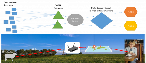 Currently, as part of Farming Connect's European Innovation Partnership Wales projects extensive grazing tracking systems are utilising a long-distance low power wireless area network (LPWAN) technology as their system to receive signals from animal devices, due to the large geographic area these signals can cover (15 - 40 km). The LPWAN receiver can be located in an area where it either has direct cabled internet access (usually on the central farm) or in a strong mobile network signal to allow regular data transmission. The power demand for transmitting data is taken on by the static receiver which can be directly powered or more easily powered via renewable energy sources such as solar.