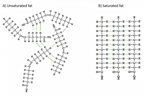 Figure 1: The molecular structure of an unsaturated and saturated fat showing proximity and formation of intramolecular forces and hydrogen bonds.