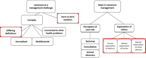 Whilst the levels above for KE were related to exchanges between researchers and producers in a human health care situation they have important implications for transfer to agriculture. Livestock disease prevention involves balancing farm economic, social, environmental and welfare goals given the income, labour, resources and support available to farmers. Alongside, such general issues it is clear that there is a requirement for tailored knowledge surrounding specific systems of practice in the UK such as outdoor, grazing heavy dairy systems, compared to systems that are more consistently indoor or conventional vs organic; each of which will have different disease impact implications. Studies highlighting specific barriers to successful KE within the confines of dairy lameness include a study across farmers, veterinarians and hoof trimmers in the US. In this, it was recognised that farmers believed there was insufficient communication and exchange between different farm advisors (in this case veterinarians and hoof trimmers) towards ensuring consistent messages are delivered to farmers on best management approaches. This was highlighted in the studies map of thematic analysis as ‘farm to farm variation’ and ‘differing definitions’ featured as key challenges in this area (see below). This is interesting as the UK and Spain centric study of dairy farmers also highlighted that value of information and knowledge given by vets was most important from a farmers perspective over any other levels of knowledge exchange interactions (such as the internet). As such, this offers weight to the importance that veterinary specialists’ opinions and messages provided need to be consistent and echoed across an exchange framework.