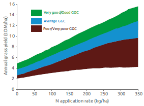 The graph below shows that even at the highest nitrogen application rates the best yields that you can expect from a poor growth potential area will be around half that of the same sward in a very good growth situation (source RB209 2017).