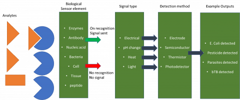 Nanobiosensors incorporate a biological element to assist their ability to sense and measure desired aspects. These can include peptides, enzymes, antibodies, cells, tissues, and nucleotide structures which are linked to a detection method, often a transducer, to create an electronic signal. Other detection methods can be visible colour change or fluorescent-based responses similar to miniaturised versions of penside testing strips. The benefits of nanobiosensors over traditional biosensors are the possibility of increased sensitivity (detecting single virus particles) as well as the high surface area small scale reactions decreasing the reaction times and sample quantity required, improving result efficiency. For such applications, high levels of research and optimisation has been put into using smartphone integrated systems to gain results, removing the requirement of purchasing specific electronic devices. The simplistic concept of the functionality of the majority of biosensors is represented graphically below.