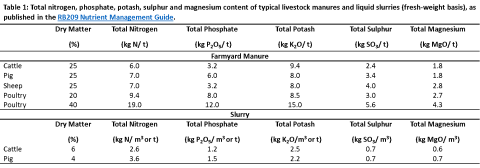 The composition of manure and slurry consists of water, organic matter and nutrients such as nitrogen (N), phosphorus (P), potassium (K(potash)), sulphur (S) and magnesium (Mg) (Table. 1). As such, the recovery of these components through recycling and re-use provides potential pathways for manure and slurry to be valorised and integrated within a circular economy. However, the composition of manure and slurry is variable and dependent on a range of factors such as livestock species, livestock diet, bedding material, and its management (handling, treatment and storage). Therefore, when considering the recovery, recycling and reuse of the components within manure and slurry, it is important to first understand its nutrient composition.