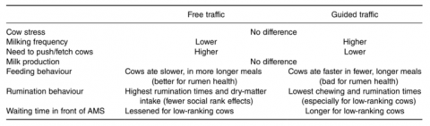 RMSs are heavily influenced by linking the milking process to a desire for feed, with many systems requiring transition through an RMS cubicle to gain access to feeding areas or to gain specific concentrate supplements. This produces an environment where cows of a higher social rank enter the system first to access feed whilst lower-ranked cattle may have longer waiting times within a waiting area before they can access the RMS and then access feed. Research has suggested that large waiting areas immediately proceeding the RMS are key to decreasing social competition and that forced traffic systems have a negative effect on low ranking cows compared to free traffic systems (see table 2). Other studies have noted the reduction of low-rank cow waiting times by including more than one RMS cubicle per pen providing opportunities for lower rank cows to avoid direct competition with higher rank cows, furthermore, this reduces issues of RMS downtime during daily or routine maintenance. RMSs layout is important to alleviating social rank issues and incorrect layout can harm welfare, with knock-on effects seen on the efficiency of the RMS as a whole as milking interval times increase leading to lower milk yields.