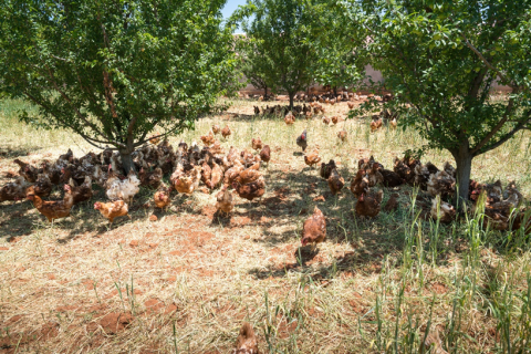 The red jungle fowl, ancestor of the domestic chicken is native to the dry forests of Southeast Asia and is a ranging and foraging bird. Organic and free-range systems are conducive to expression of natural behaviour linked to the chicken’s ancestry. In these systems the birds, in addition to having access to a hen house, have access to an outdoor run which provides larger space allowances, a higher number and variety of stimuli and the opportunity to