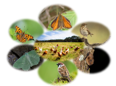 In many parts of the world, including the UK, intensive farming practices have negative effects on local biodiversity. . A remarkable consequence of agroforestry is the increase in biodiversity when compared with farming alone. The presence of shrubs and trees greatly increases the cover for wild birds and mammals. The greater range of plants increases the number of larger insects and the more complex soil increases soil insects and invertebrates. A series of annual wildlife surveys undertaken on 9 woodland egg units in Cumbria from 2016-2019 by the Woodland Trust reveal that “Trees on hen ranges are haven for wildlife”. The survey reported that redshank (Periscaria maculosa) and corn chamomile (Anthemis arvensis), a common feature of many of the unmown areas on the ranges were attractive to butterflies and other invertebrates. In the bird surveys, 59 species of birds were recorded on these ranges, of which 12 are currently included in the Red List of Birds of Conservation Concern including song thrush, tree sparrow and linnet and a further 11 on the Amber list such as meadow pipit and bullfinch. Fourteen species of butterflies were recorded, the majority being common species, but exceptions were the comma butterfly, Polygonia c-album, which normally breeds and hibernates in open woodland and wood edges and the small skipper, Thymelicus sylvestris, whose numbers have been expanding after decades of decline. One hundred and two species of moths were recorded and their numbers were highest in the established ranges compared to the intermediate and new (age of the range) ranges. The surveys observed a correlation between the age of trees and numbers of moths. Bats were recorded on all 9 sites each year. The uninterrupted rows of trees were advantageous to bats as they attracted invertebrates for bats to forage. Overall, the combination of planted trees and structurally diverse ground cover vegetation creates areas of a woodland edge type habitat in the free-range hen ranges and benefits birds, bats and their prey.