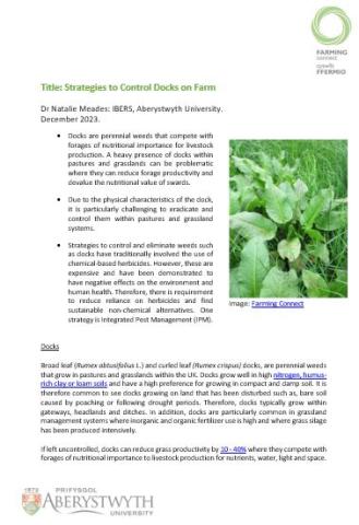 Broad leaf (Rumex obtusifolius L.) and curled leaf (Rumex crispus) docks are perennial weeds that compete with forages of nutritional importance for livestock production. Heavy infestations of docks within pastures and grasslands can reduce forage productivity and decrease the nutritional value of swards. As such it is important that strategies are put in place to prevent and control docks on farm. Herbicides have traditionally been used to control docks; however, they are expensive and there is concern regarding the negative effects of herbicides on the environment and on human health. As such, there is drive to minimise their use. One strategy is Integrated Pest Management (IPM) which involves a range of non-chemical control strategies to detect, prevent and control weeds. This still means that chemical herbicides can be used but following the use of non-chemical control strategies first, herbicide use should be much less and therefore minimised.
