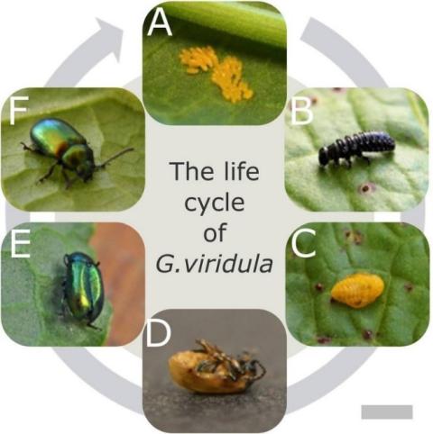Figure 1: The lifecycle of the green dock leaf beetle (Gastrophysa viridula) with approximate days of development from an egg to an adult. Where A) represents the egg (day 0-7), B) represents the larval stages (days 8-18), C) represents the pupa (days 18-25), D) represents after ecdysis (day 25), E) represents the final cuticle expansion (day 26) and F) represents the adult beetle. Image and description by Onelli, et al. (2017).