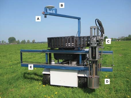Figure 3: A robot that can detect docks and destroy them. A) represents a boom mounted camera, B) GPS antenna, C) Hydraulic motor for the weeder, D) the weeder and E) the rail that allows for the lateral movement of the weeder Image and description by van Evert, et al. (2011).