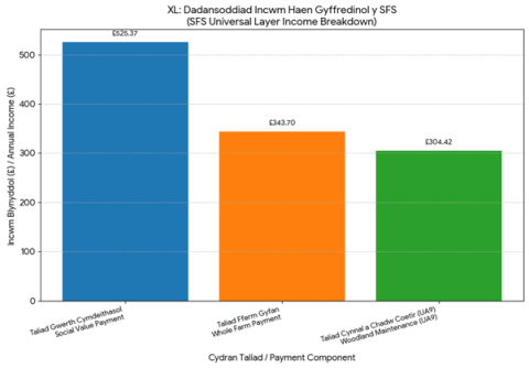 Figure 1. The breakdown of the Total Annual Universal Income (total of £1,173.49) from the Sustainable Farming Scheme's (SFS) Universal Layer for the 4.91ha Silvopasture system at Ty'n yr Onnen (in addition to the income incurred through productivity). The Social Value Payment rewards climate resilience and other Sustainable Land Management (SLM) options, the Whole Farm Payment is calculated for this area and the Woodland Maintenance Payment is for managing tree cover.