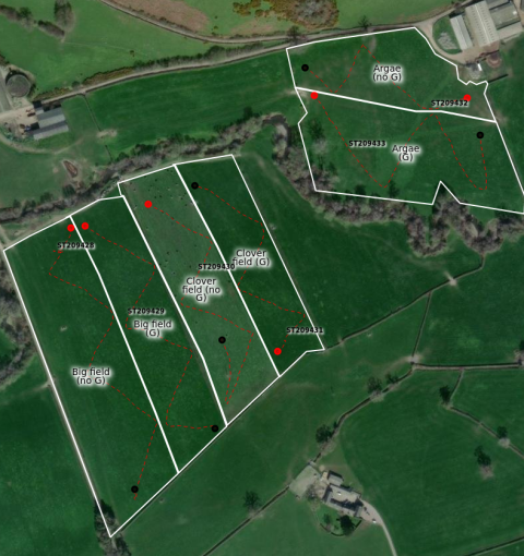 Figure 1 - Three fields split in half to create 6 plots. ‘G’ - Gypsum. ‘No G’ - control.