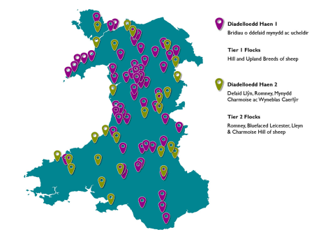 95 flocks form the Welsh Sheep Genetics Programme, and are located across Wales. The map below shows the locations of participating flocks for both Tier 1 and Tier 2 breeds.